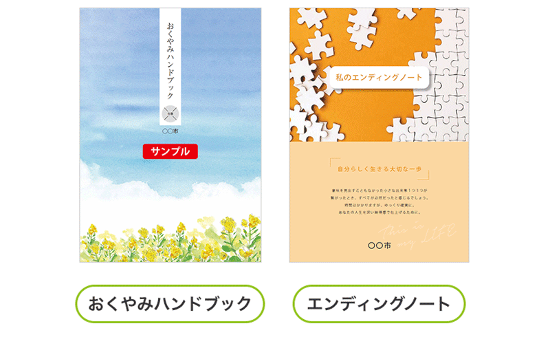 おくやみハンドブック、エンディングノート、終活べんり帳、空き家ガイドブック、相続ガイドブック、介護保険ガイドブックなど、終活に関連する情報をまとめた各種冊子を無償で制作・提供していまる。行政手続きから相続、空き家、介護まで幅広い情報を整理し、住民が必要な知識を一冊で確認できるようにしている。